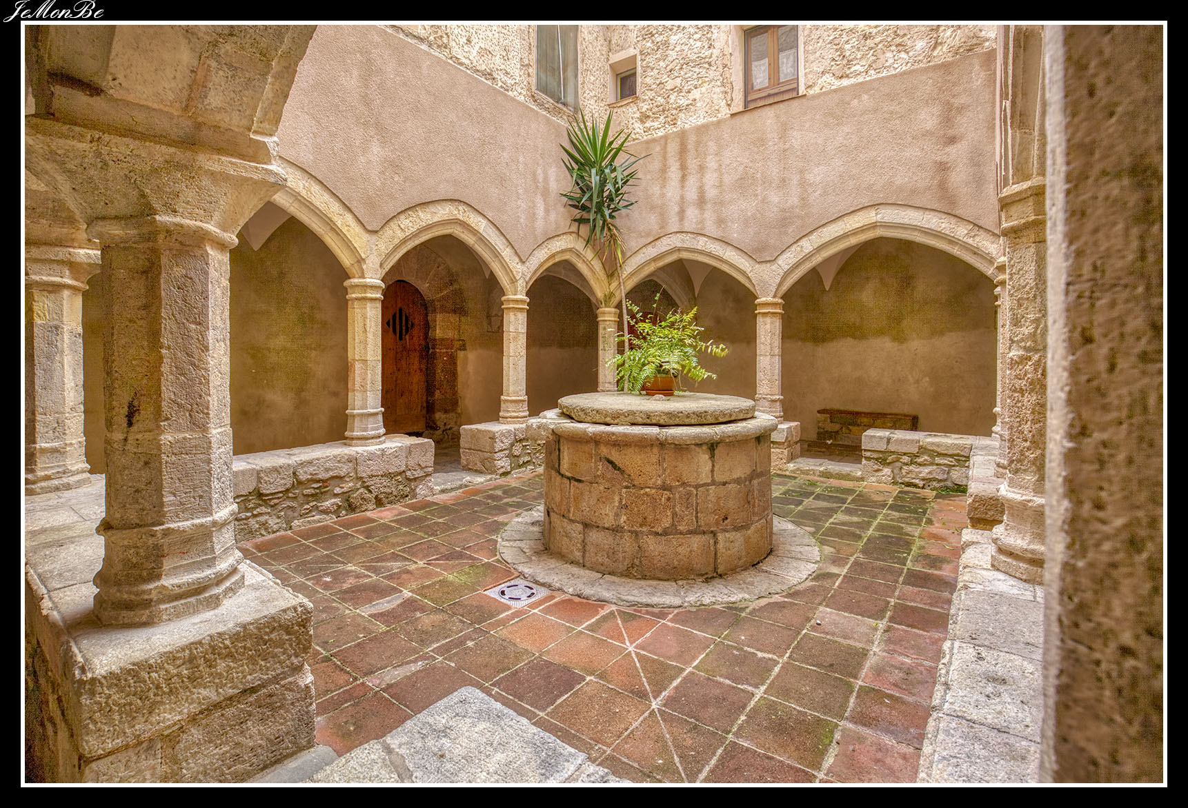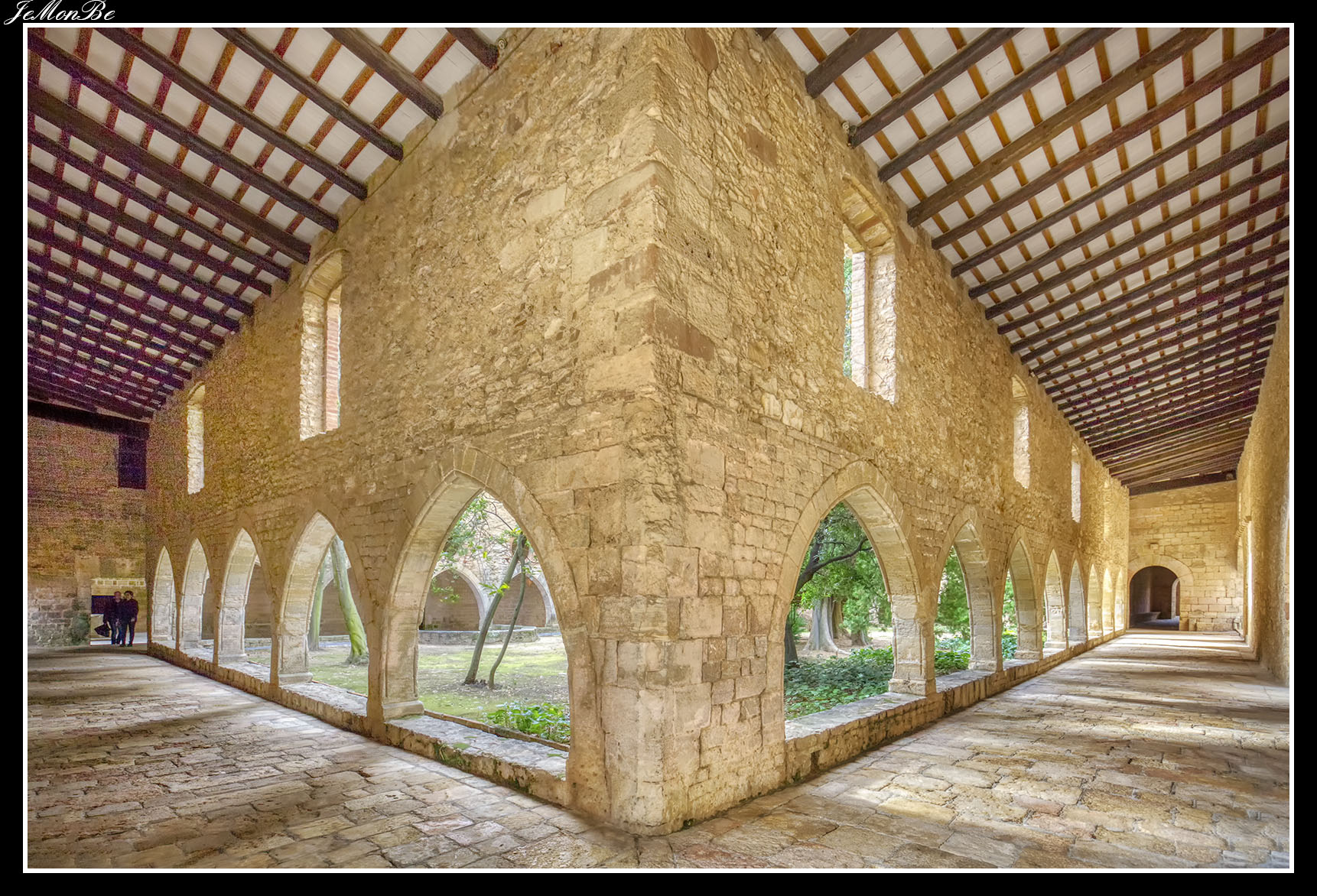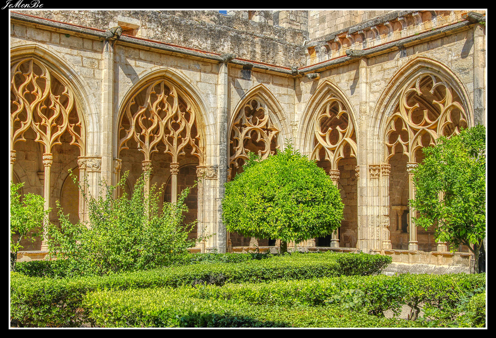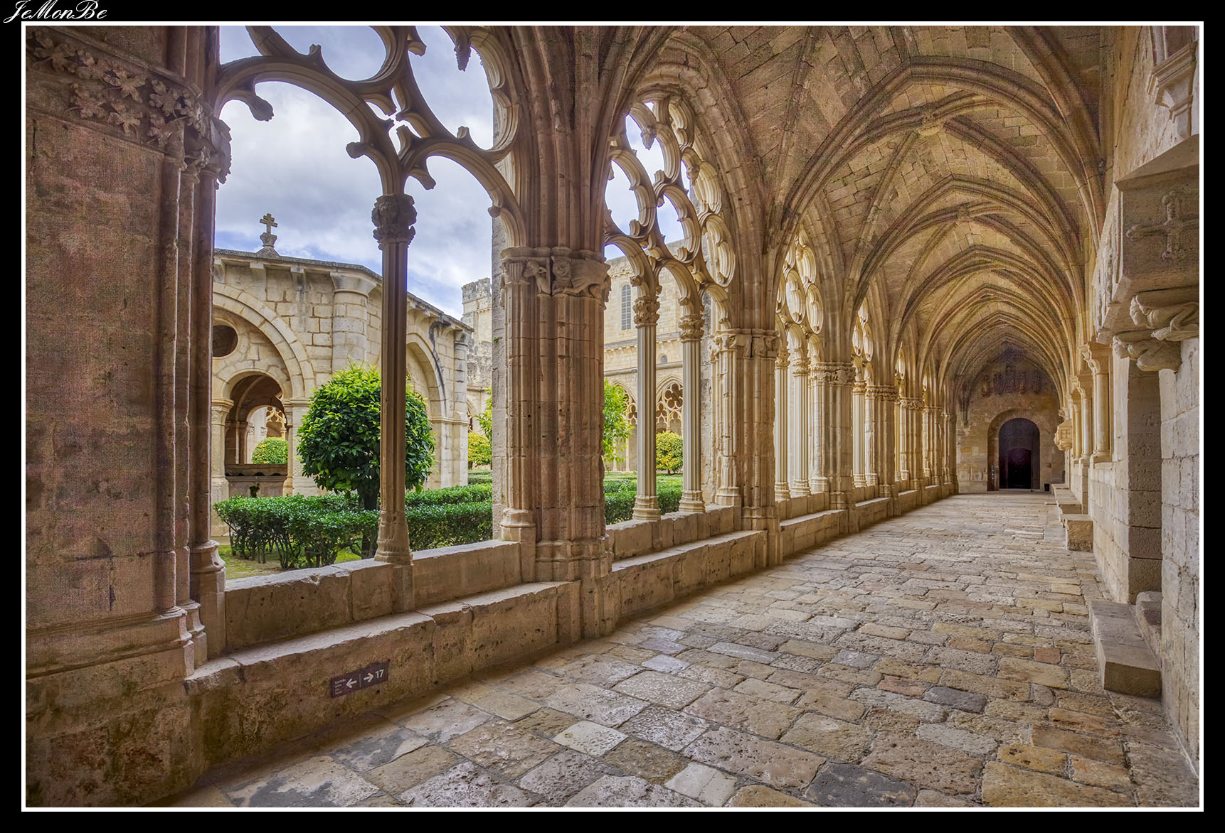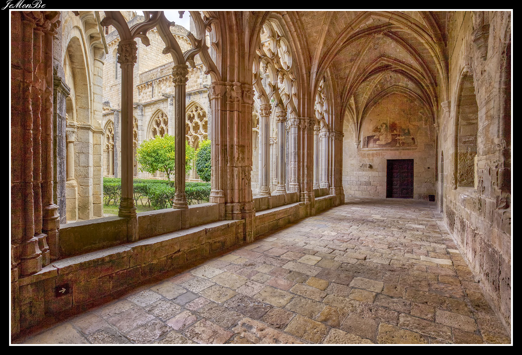 Al entrar por el Arco Real se aprecia una gran plaza rectangular, en cuyo centro se encuentra una fuente sobre la que hay una estatua dedicada a san Bernardo Calbó, antiguo abad del monasterio. Alrededor de la plaza se encuentran las diversas dependencias monacales antiguas, donde habitaban los monjes más ancianos y los que trabajaban en diversos oficios; todas muestran en sus fachadas decoraciones con esgrafiados realizados durante el siglo XVIII. Entre estos edificios se encuentra el antiguo hospital del monasterio. La parte más resaltable es un pequeño patio con arcos apuntados y una galería con doble arcada. El fondo de la plaza está ocupada por la fachada de la iglesia y la entrada de la Puerta Real, donde se aprecia el intento de amurallamiento decretado por el rey Pedro IV el Ceremonioso por las almenas que coronan toda la iglesia.