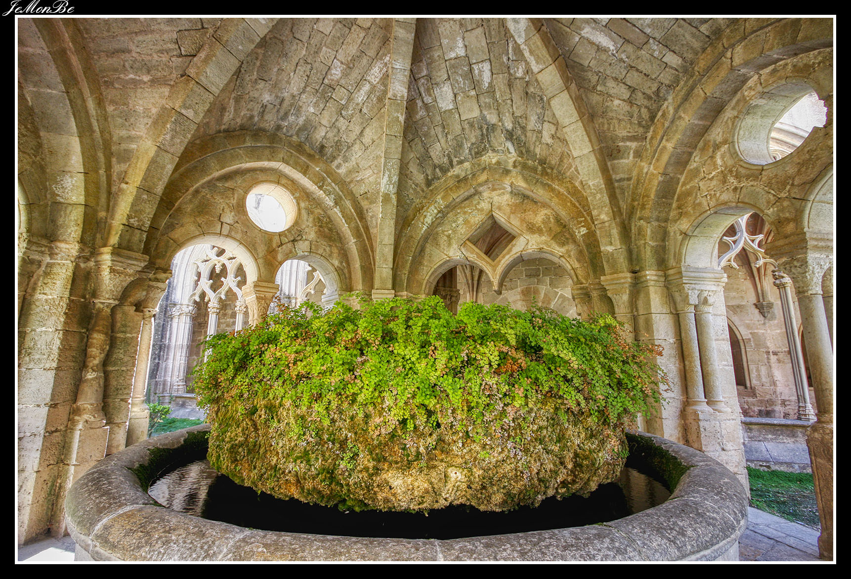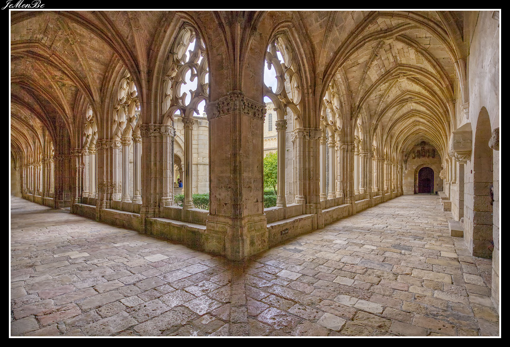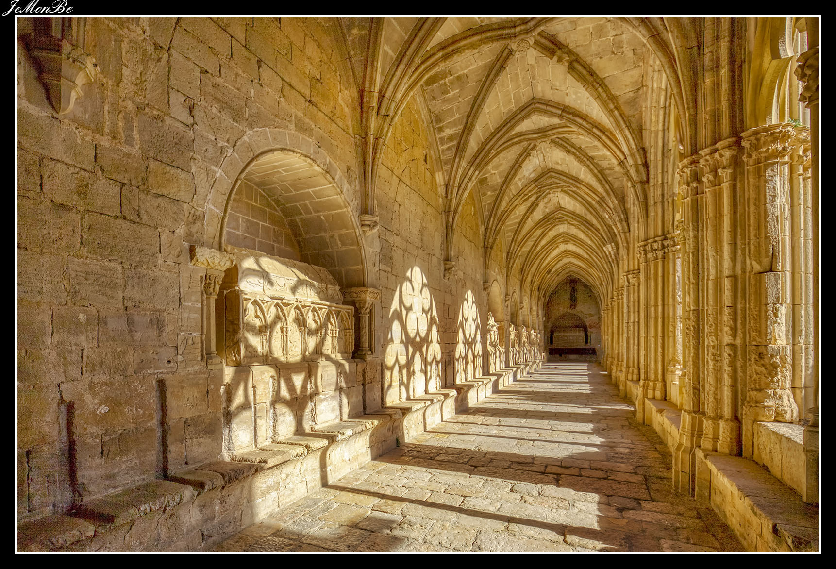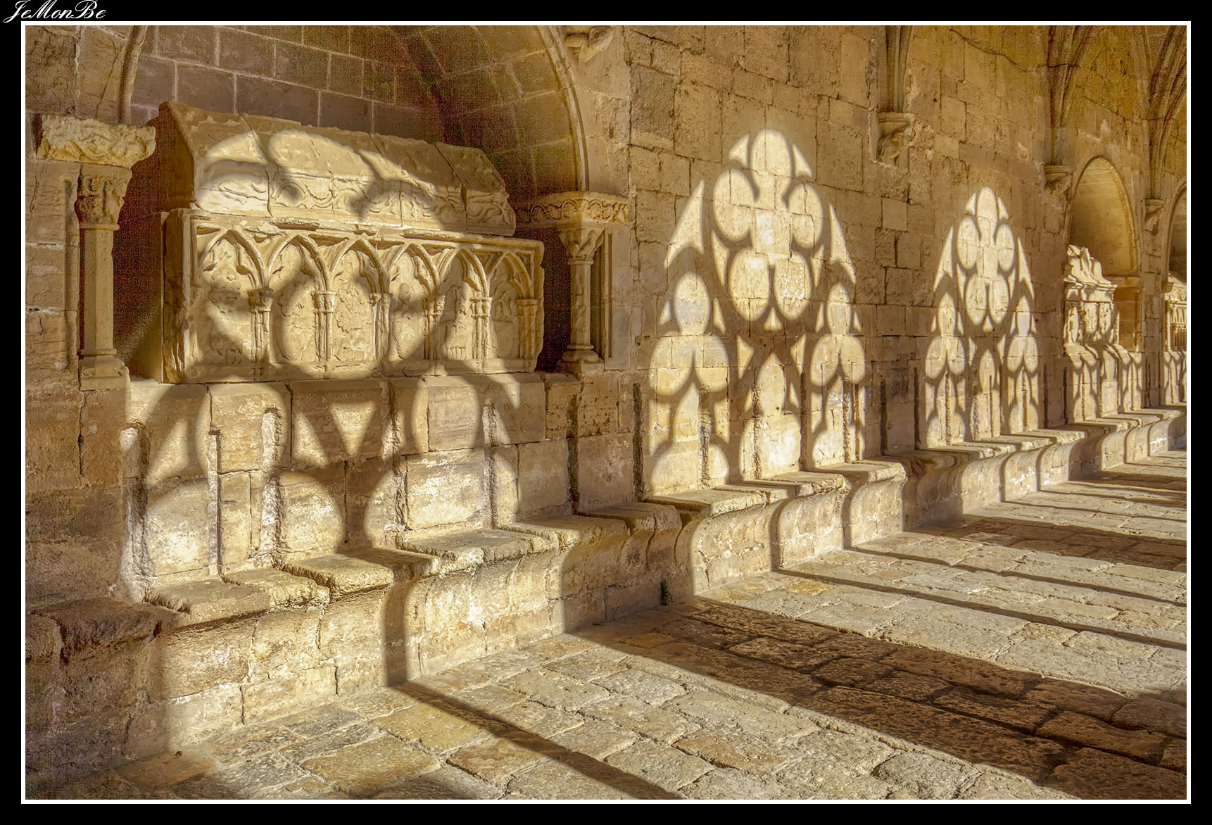 Al entrar por el Arco Real se aprecia una gran plaza rectangular, en cuyo centro se encuentra una fuente sobre la que hay una estatua dedicada a san Bernardo Calbó, antiguo abad del monasterio. Alrededor de la plaza se encuentran las diversas dependencias monacales antiguas, donde habitaban los monjes más ancianos y los que trabajaban en diversos oficios; todas muestran en sus fachadas decoraciones con esgrafiados realizados durante el siglo XVIII. Entre estos edificios se encuentra el antiguo hospital del monasterio. La parte más resaltable es un pequeño patio con arcos apuntados y una galería con doble arcada. El fondo de la plaza está ocupada por la fachada de la iglesia y la entrada de la Puerta Real, donde se aprecia el intento de amurallamiento decretado por el rey Pedro IV el Ceremonioso por las almenas que coronan toda la iglesia.