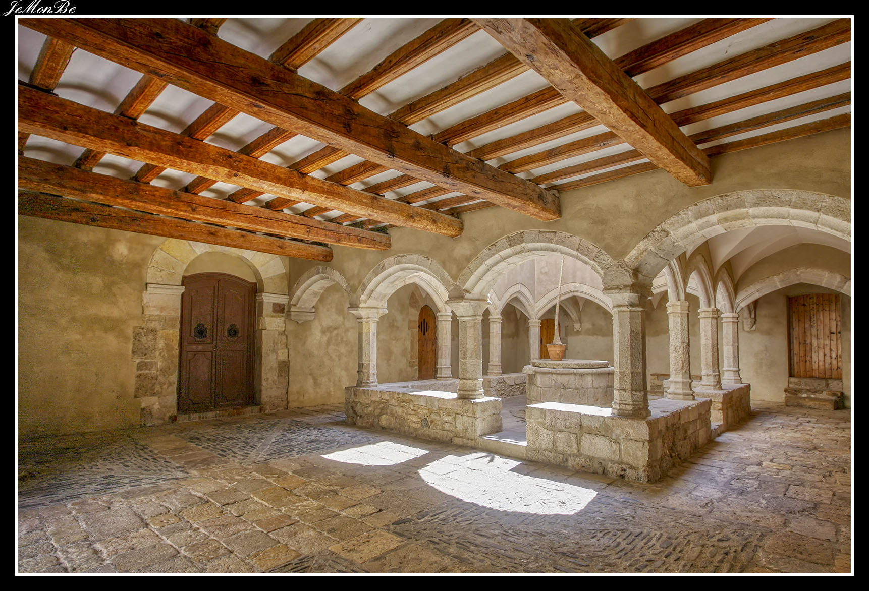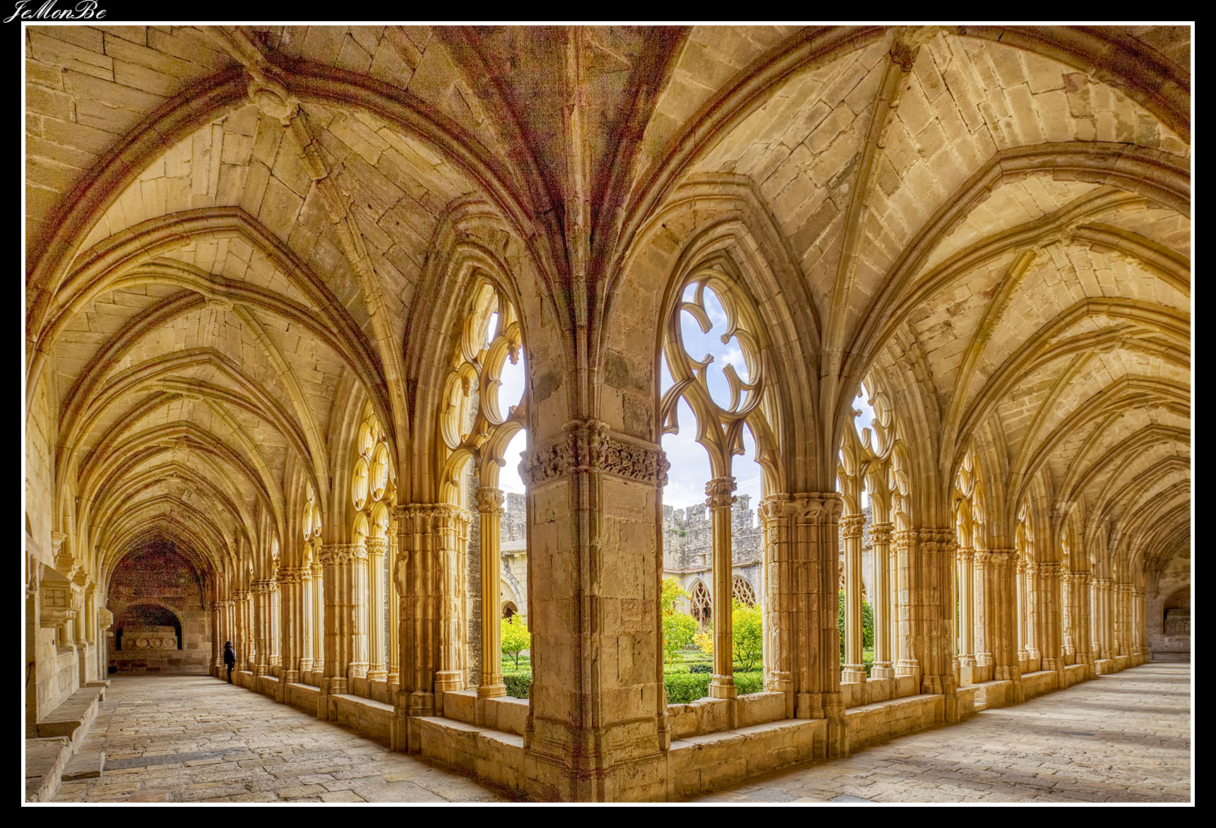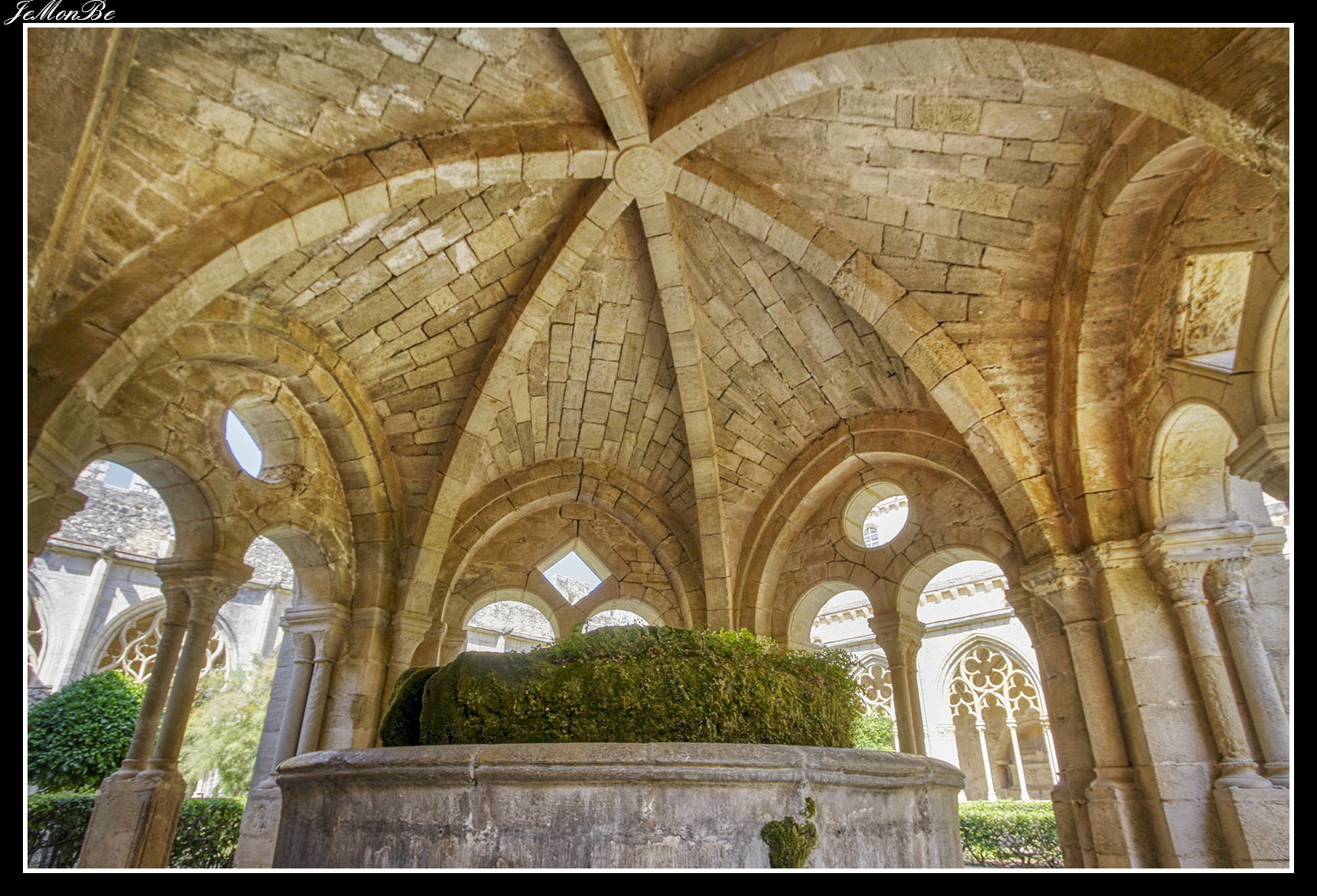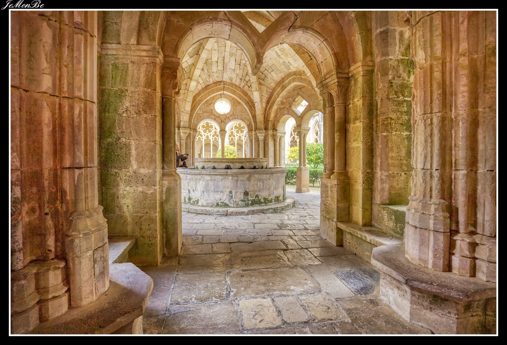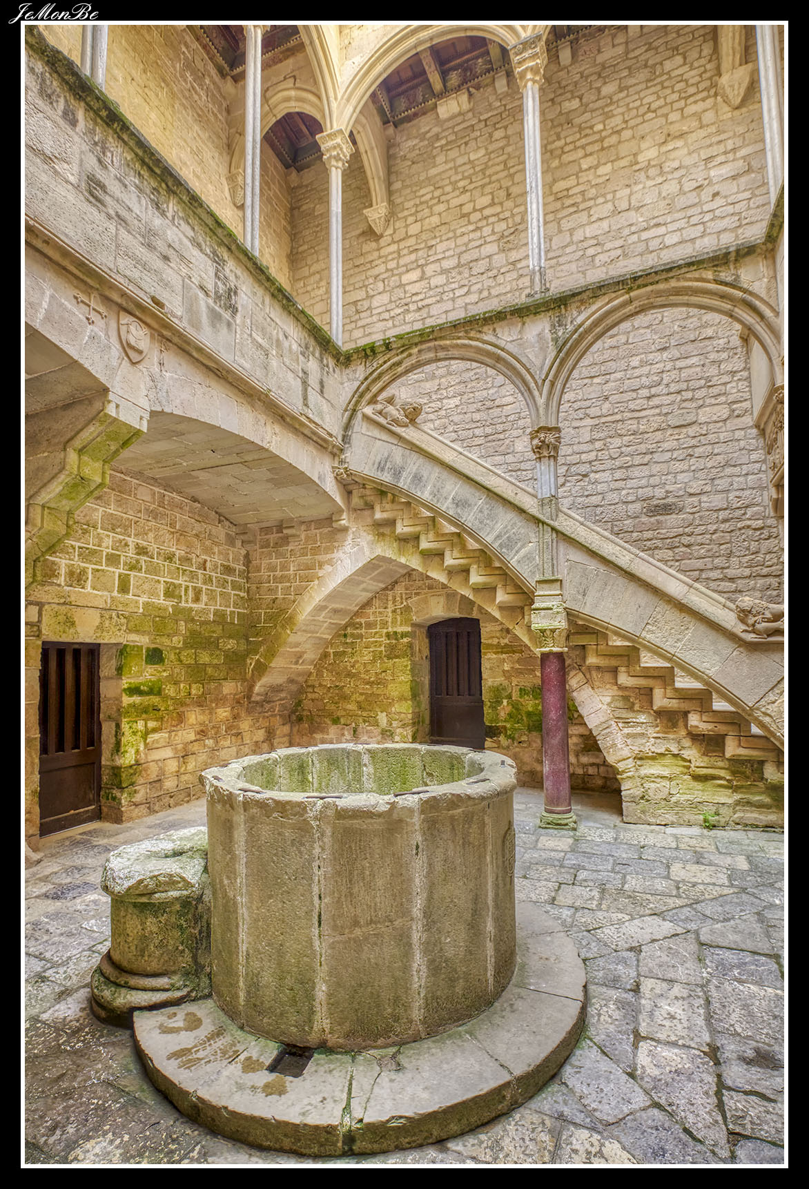 Al entrar por el Arco Real se aprecia una gran plaza rectangular, en cuyo centro se encuentra una fuente sobre la que hay una estatua dedicada a san Bernardo Calbó, antiguo abad del monasterio. Alrededor de la plaza se encuentran las diversas dependencias monacales antiguas, donde habitaban los monjes más ancianos y los que trabajaban en diversos oficios; todas muestran en sus fachadas decoraciones con esgrafiados realizados durante el siglo XVIII. Entre estos edificios se encuentra el antiguo hospital del monasterio. La parte más resaltable es un pequeño patio con arcos apuntados y una galería con doble arcada. El fondo de la plaza está ocupada por la fachada de la iglesia y la entrada de la Puerta Real, donde se aprecia el intento de amurallamiento decretado por el rey Pedro IV el Ceremonioso por las almenas que coronan toda la iglesia.