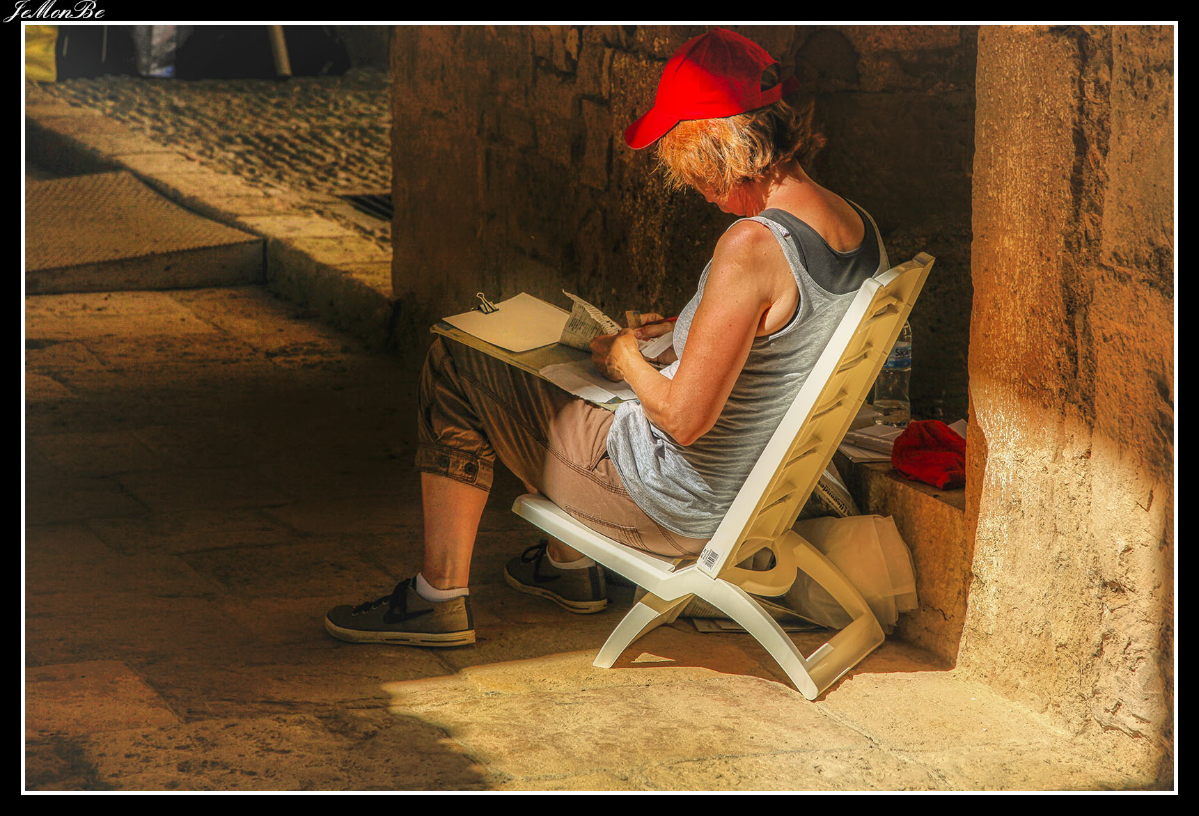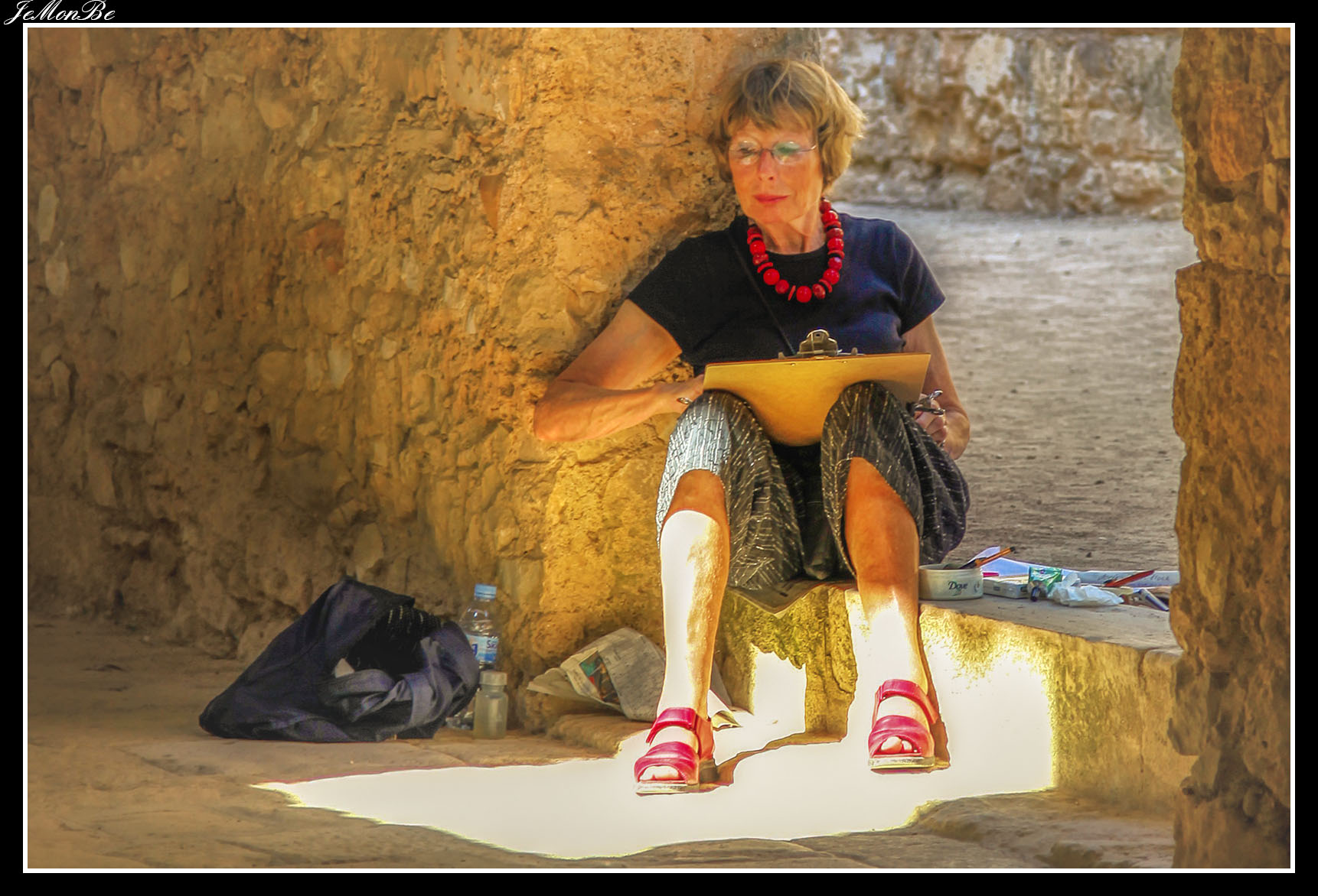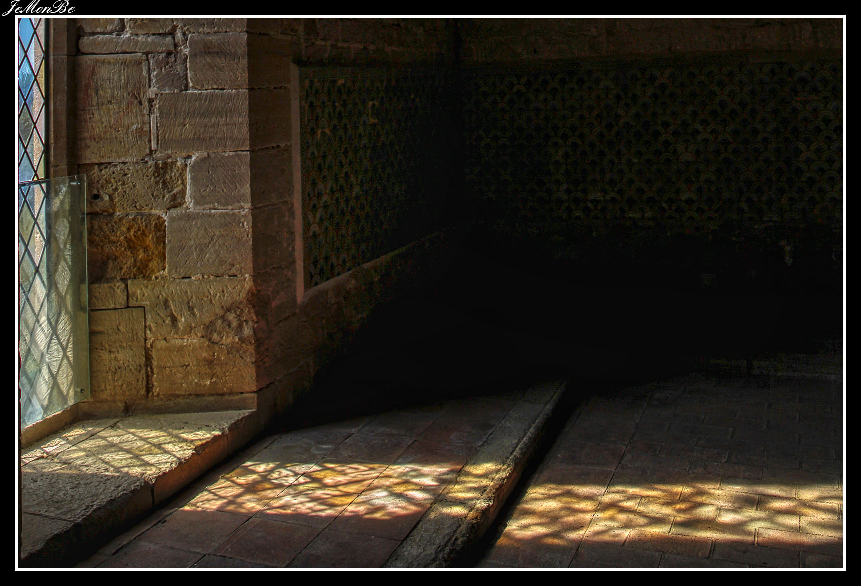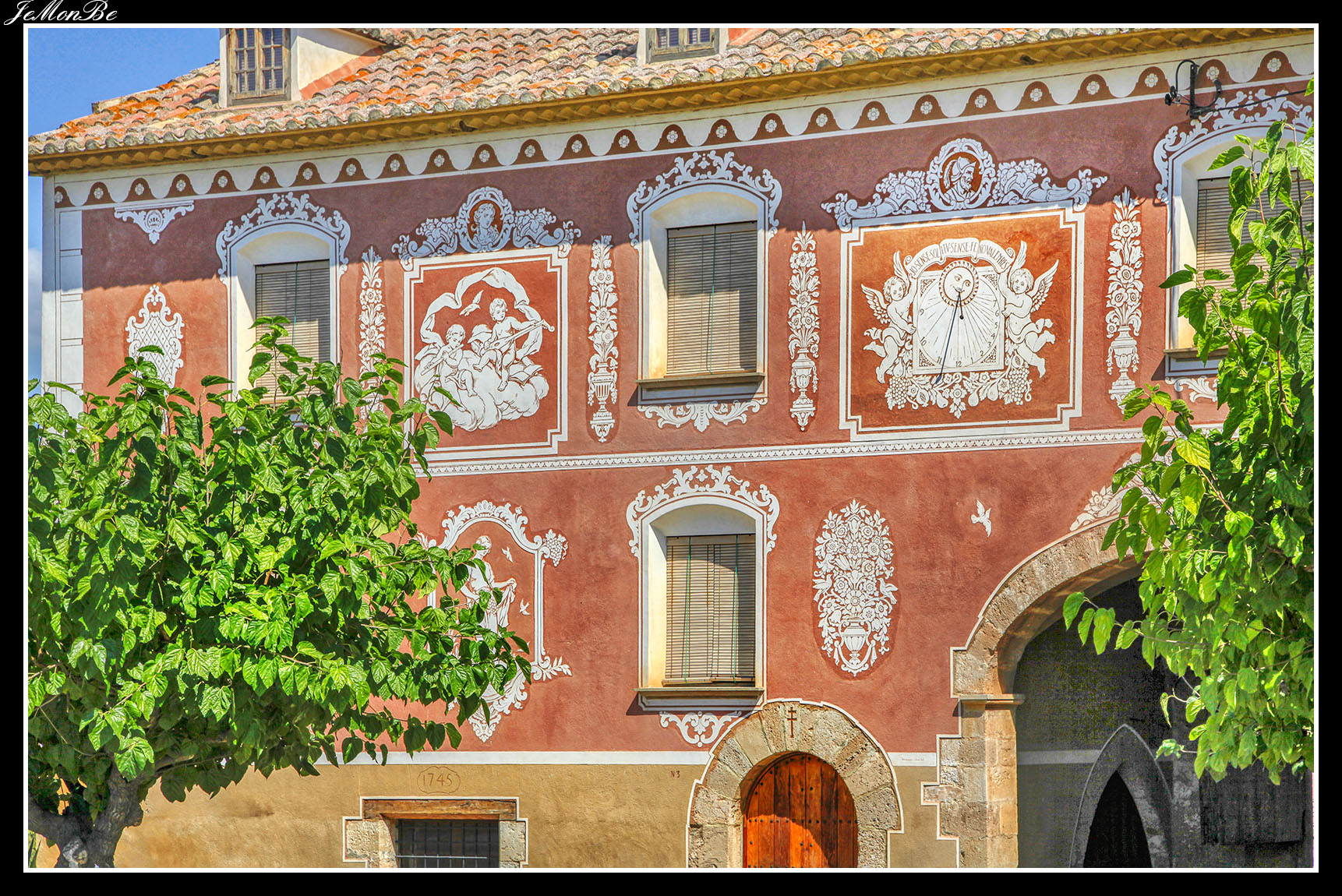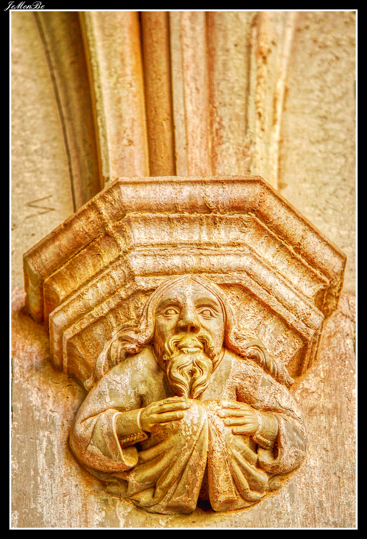 Al entrar por el Arco Real se aprecia una gran plaza rectangular, en cuyo centro se encuentra una fuente sobre la que hay una estatua dedicada a san Bernardo Calbó, antiguo abad del monasterio. Alrededor de la plaza se encuentran las diversas dependencias monacales antiguas, donde habitaban los monjes más ancianos y los que trabajaban en diversos oficios; todas muestran en sus fachadas decoraciones con esgrafiados realizados durante el siglo XVIII. Entre estos edificios se encuentra el antiguo hospital del monasterio. La parte más resaltable es un pequeño patio con arcos apuntados y una galería con doble arcada. El fondo de la plaza está ocupada por la fachada de la iglesia y la entrada de la Puerta Real, donde se aprecia el intento de amurallamiento decretado por el rey Pedro IV el Ceremonioso por las almenas que coronan toda la iglesia.