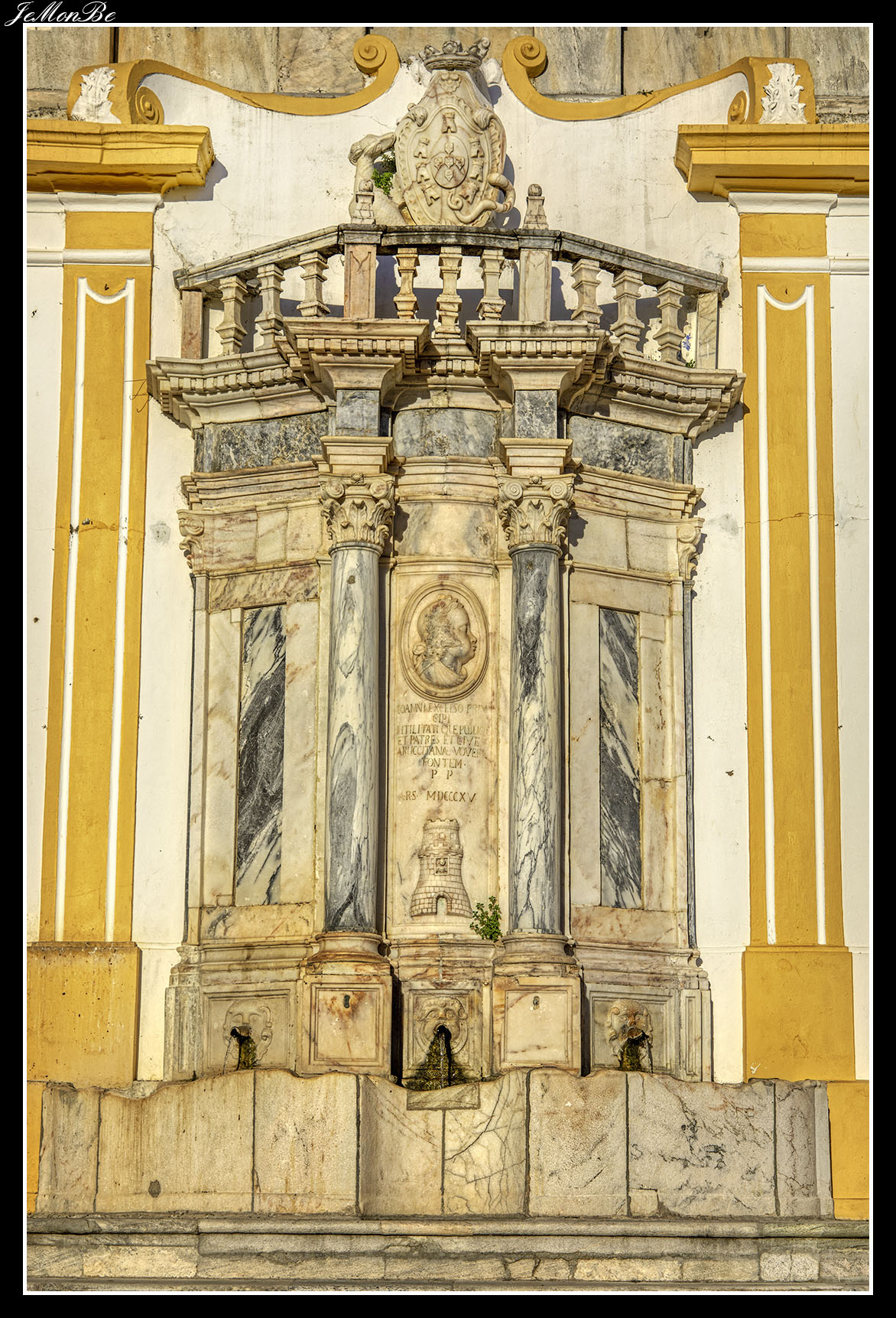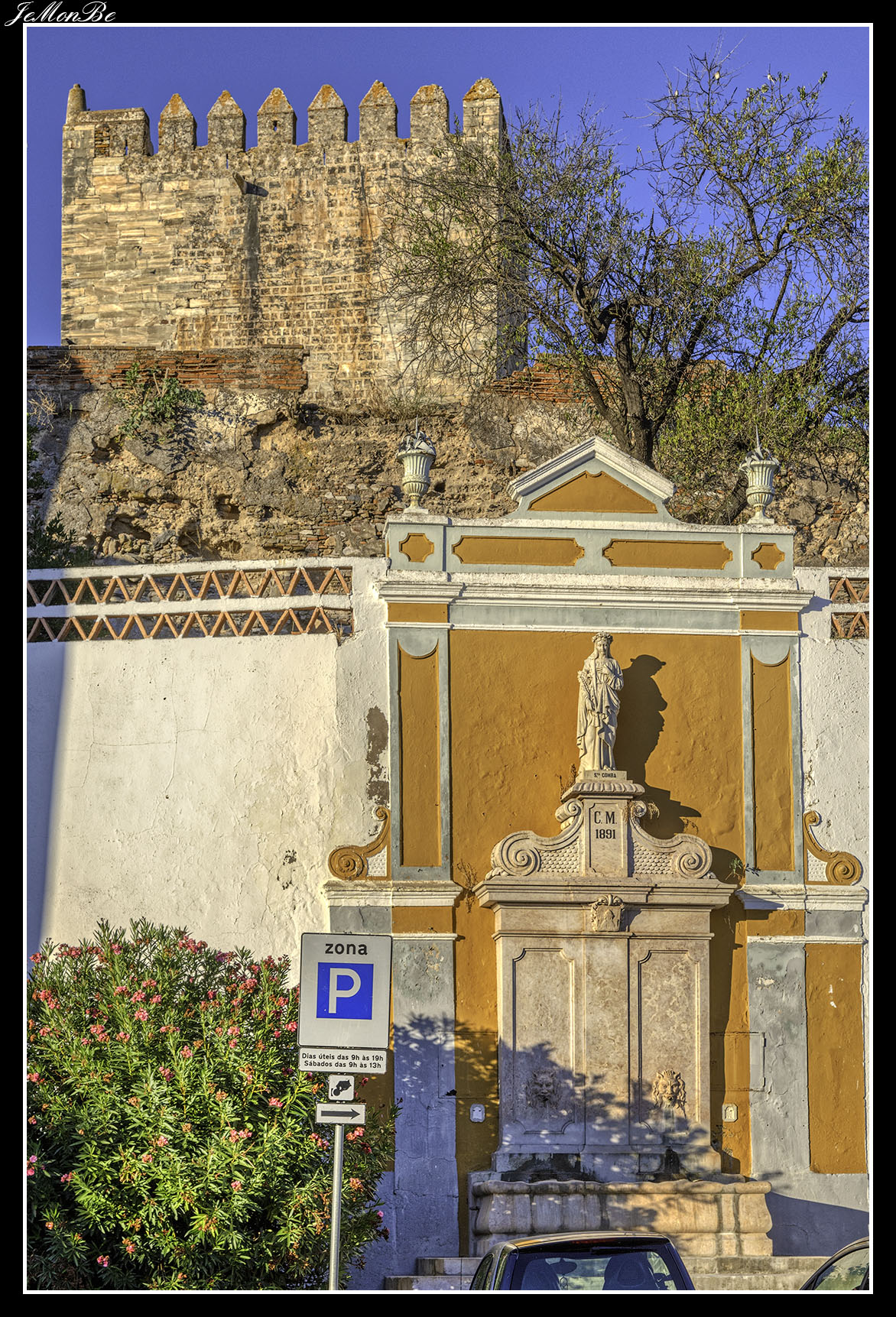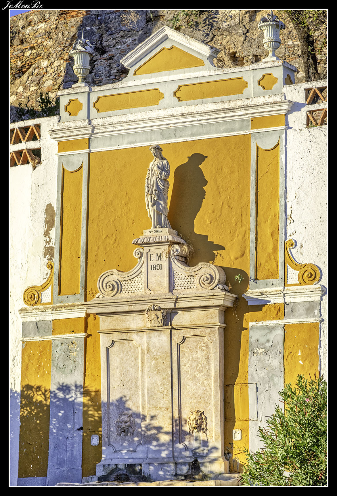 Situada frente a la biblioteca municipal de Moura, a la entrada del antiguo balneario y del parque de Santiago, tenemos una fuente de mármol del siglo XIX. Se llama fuente de las “Tres Bicas”, por los 3 caños de los que sale el agua.