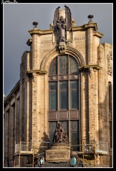La puerta principal está coronada por una gran figura maternal en bronce con su progenie flanqueada por dos escudos uno el escudo de armas de Paisley, el otro el símbolo de Esculapio, Dios de la Medicina con una serpiente retorcida alrededor de un bastón. Ambos están en cobre con el esmalte heráldico en color brillante. Por encima de la ventana grande está la masiva figura de bronce de un ángel protector que guarda a la joven generación en sus brazos con el lema A DEO SALUS «La salud viene de Dios Esta frase esculpida en la obra de piedra.