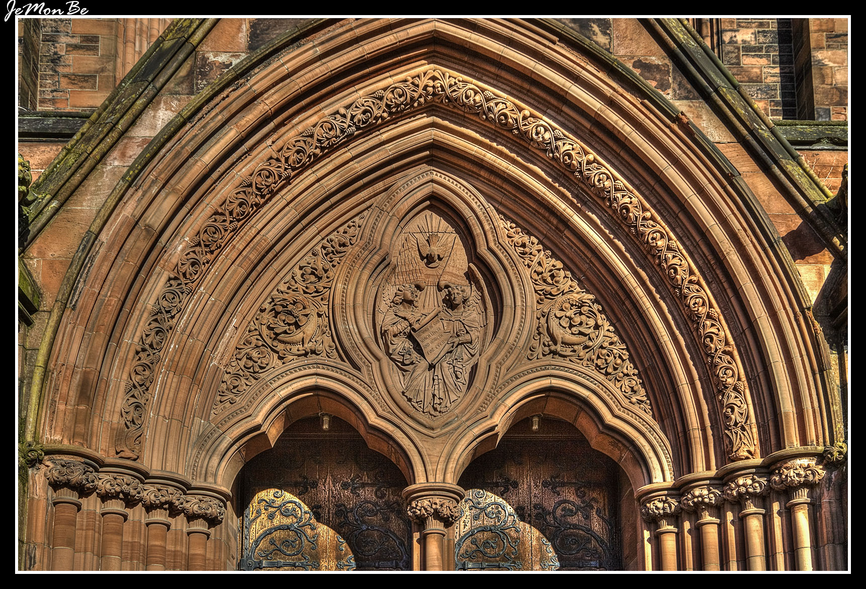 La iglesia es de estilo gótico renacentista en piedra arenisca roja, en forma cruciforme. La torre central se eleva con un campanario abierto en corona (60 metros). En la parte delantera un conjunto de escaleras conducen a tres puertas de roble. Caben casi 1000 personas bajo el techo abovedado.