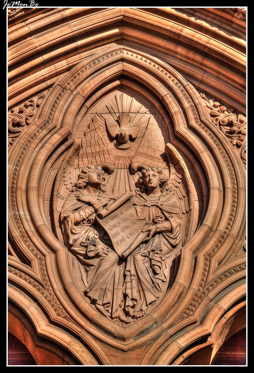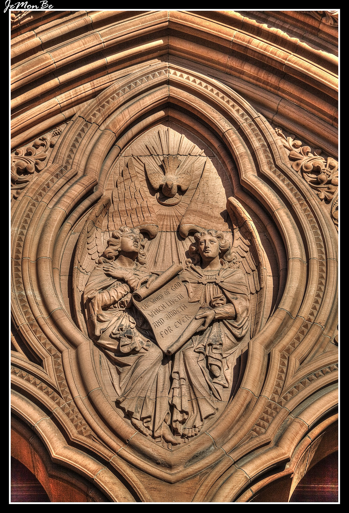 La iglesia es de estilo gótico renacentista en piedra arenisca roja, en forma cruciforme. La torre central se eleva con un campanario abierto en corona (60 metros). En la parte delantera un conjunto de escaleras conducen a tres puertas de roble. Caben casi 1000 personas bajo el techo abovedado.