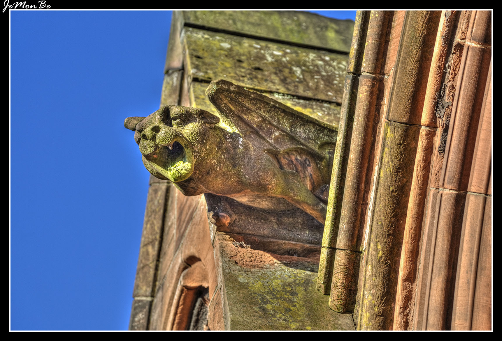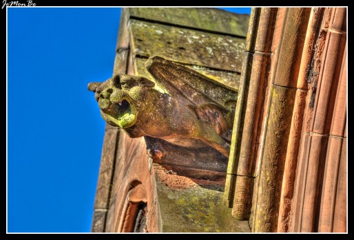 La iglesia es de estilo gótico renacentista en piedra arenisca roja, en forma cruciforme. La torre central se eleva con un campanario abierto en corona (60 metros). En la parte delantera un conjunto de escaleras conducen a tres puertas de roble. Caben casi 1000 personas bajo el techo abovedado.