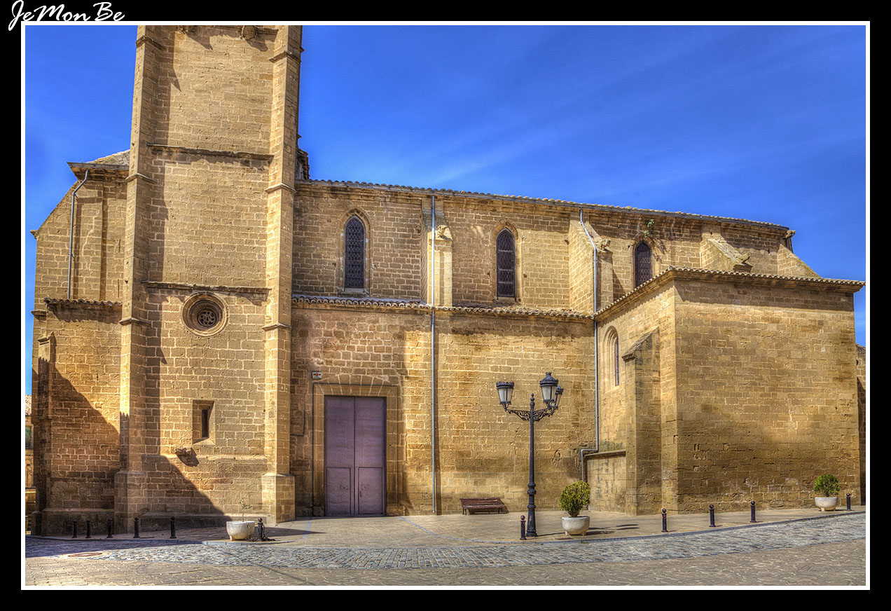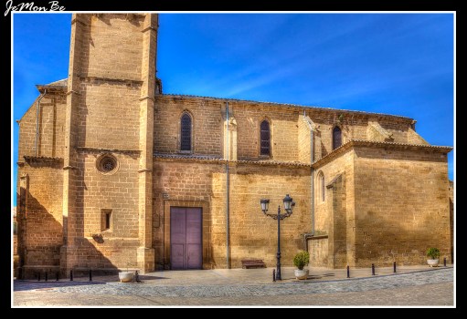 Al exterior presenta dos portadas de acceso, una en el lado de la Epístola y otra a los pies de la iglesia, considerada como puerta principal y que presenta estructura gótica con seis arquivoltas en arco apuntado y decoración renacentista en torno al tímpano. Destacaría también la torre, en piedra arenisca, como el resto de la iglesia, cuyo elemento más característico sería el remate con una crestería, pináculos, una aguja maciza y decoración vegetal de tradición gótica.