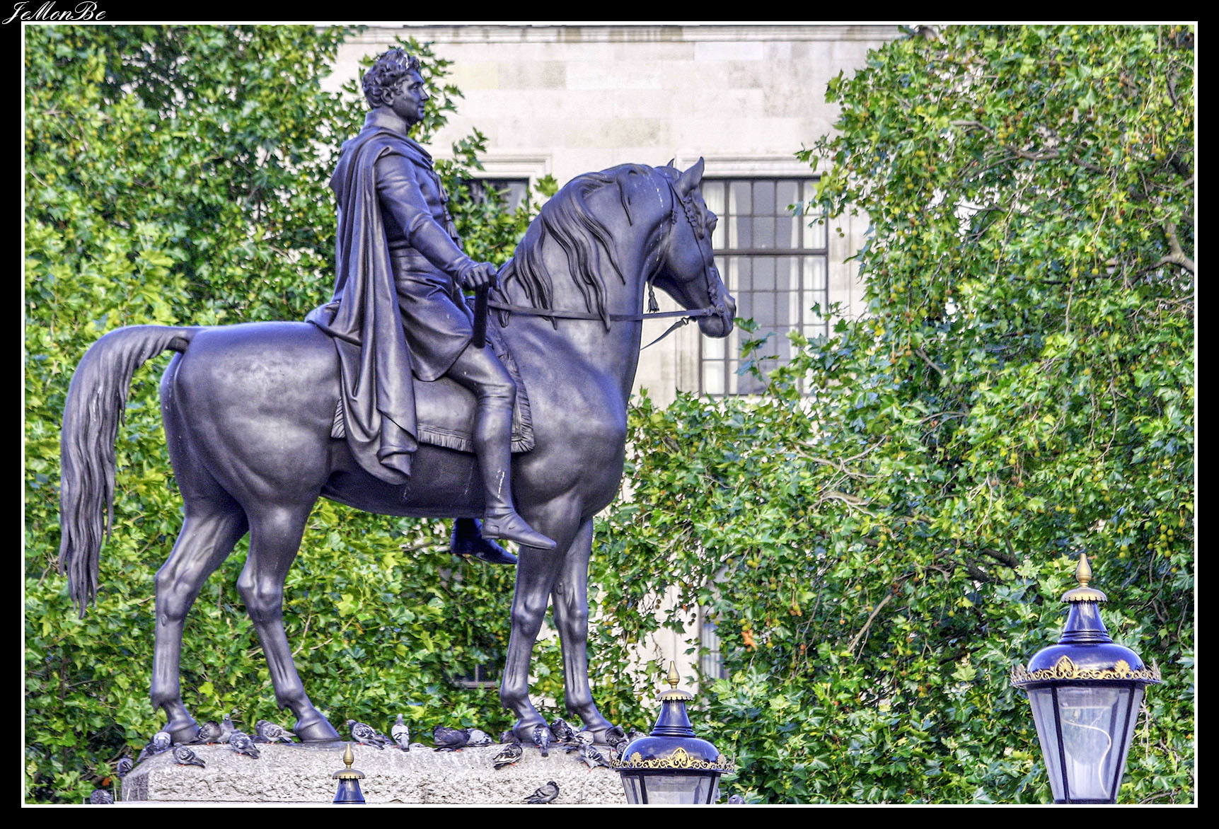 Estatua ecuestre del rey Jorge IV montando a pelo con una armadura romana.