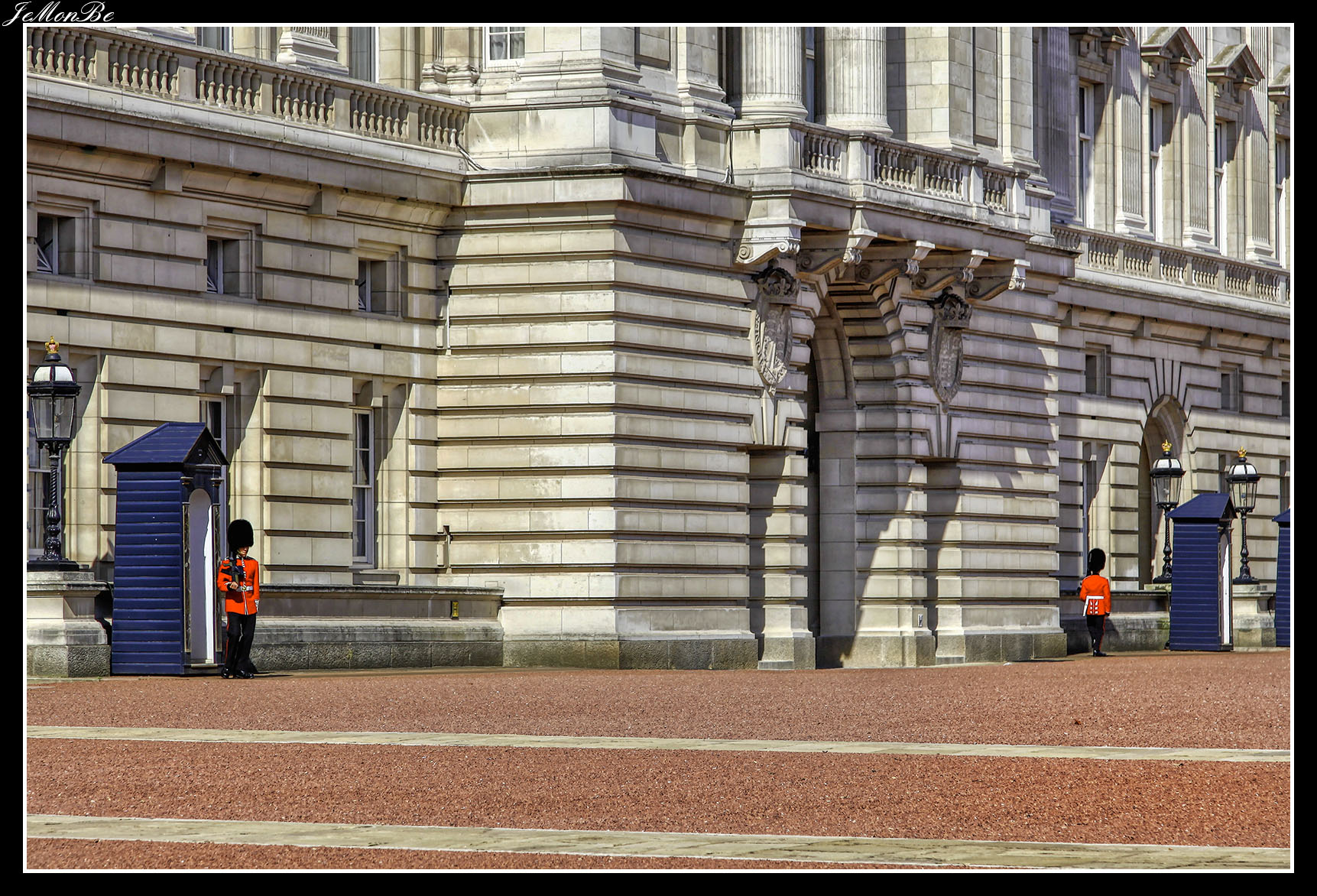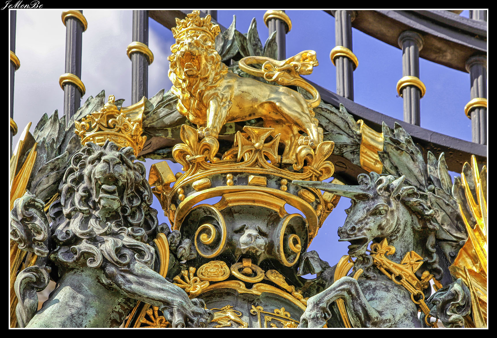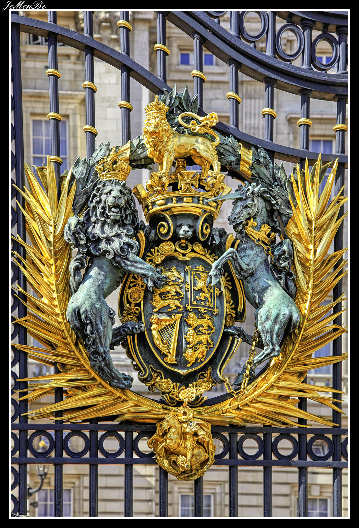 En las puertas principales del palacio de Buckingham esta el escudo de armas real británico. Un león que simboliza a Inglaterra y un unicornio a Escocia que encierran cuatro cuadrantes, en ellos diagonalmente hay tres leones caminando que representan a Inglaterra, el arpa es para Irlanda y el león erguido es para Escocia.